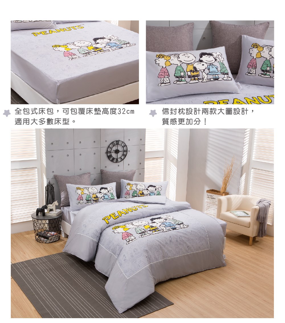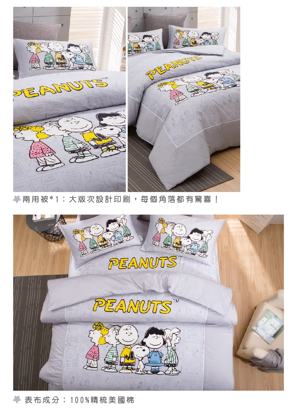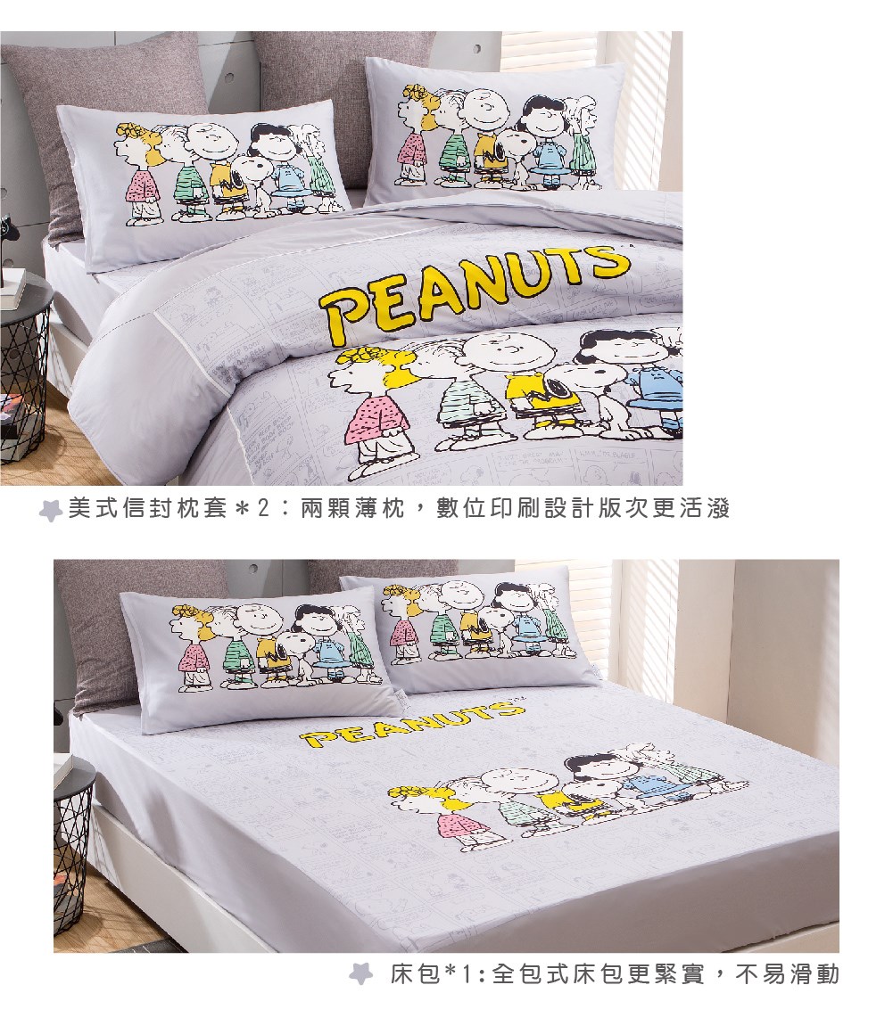 • 美國官方PEANUTS花生漫畫正版授權 • 奧斯汀寢飾獨家設計 • 內容件數-床包1件、薄枕套2個、鋪棉兩用被1件(單人尺寸枕套1個)