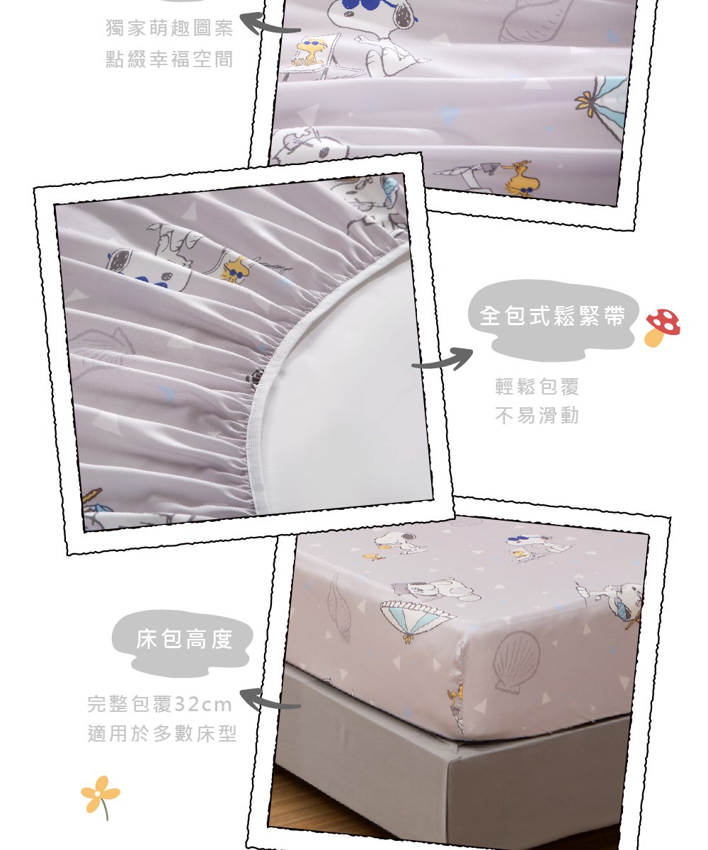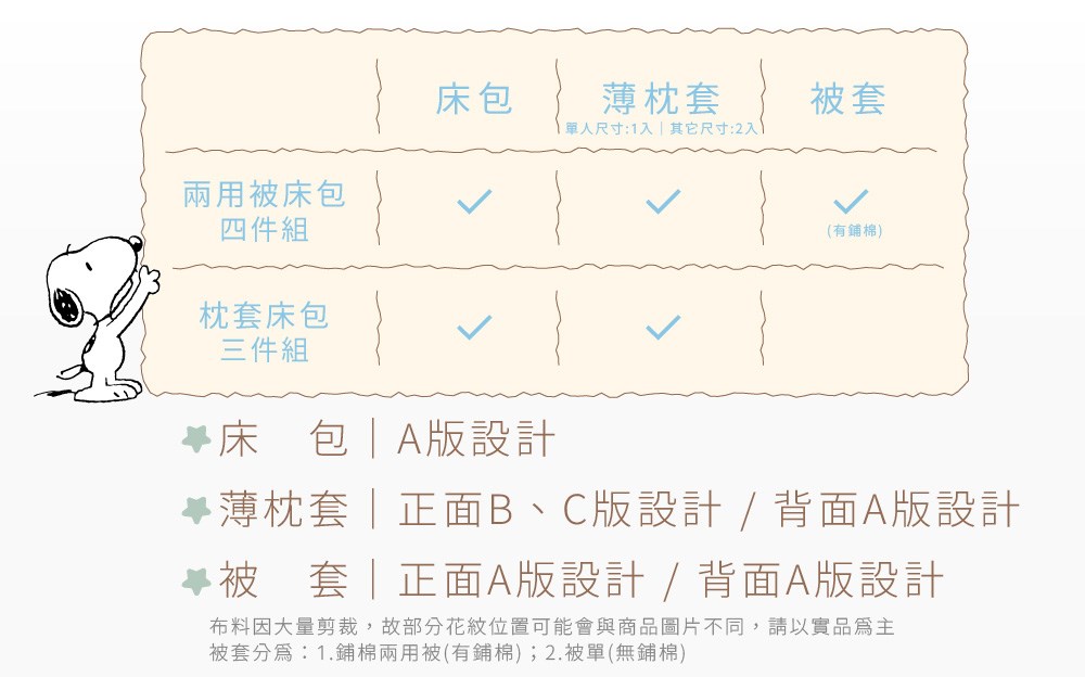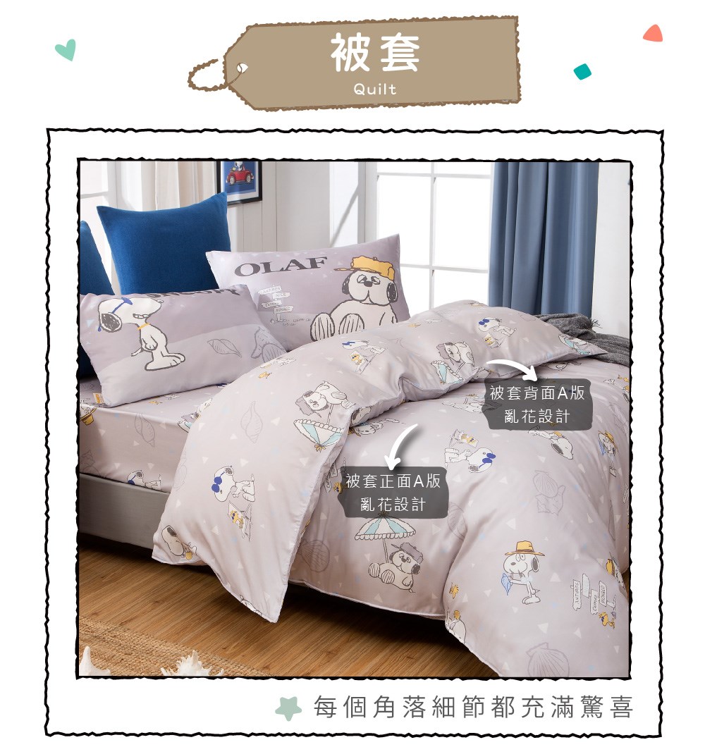 • 內容件數-床包1件、薄枕套2個、鋪棉兩用被1件